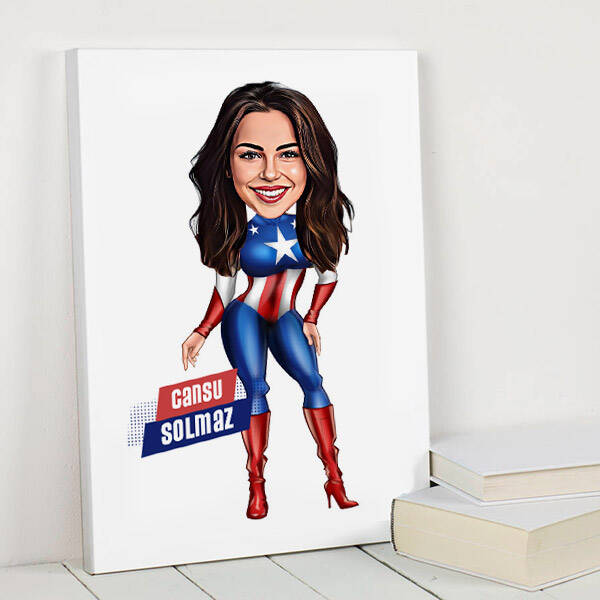 Amarikalı Kahraman Kostümlü Kadın Karikatürlü Kanvas Tablo