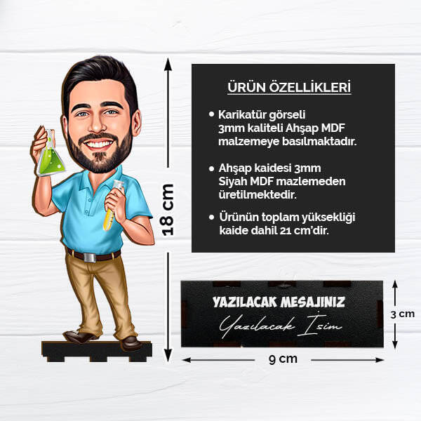 ** Biblo Ölçüleri: 18 cm uzunluk - Kaide ölçüleri: 9 x 3 cm.** Karikatür baskısı 3 mm kalınlıkta kaliteli MDF malzeme üzerine uygulanmaktadır.** Ahşap kaidesi siyah renk MDF malzemeden üretilmiş olup, dilediğiniz isim veya mesaj lazer ile üzerine kazınmaktadır.** Bu Komik Bibloyu kişiye özel hale getirebilmemiz için Sepete Ekle butonu üzerindeki dosya ekle kısmından fotoğraf seçip yüklemeniz gerekmektedir.** Araştırma Yapan Öğretmen Karikatürlü Biblo hafta içi saat 14.00'a kadar verilecek siparişler için aynı gün kargoya teslim edilmektedir.** Lütfen Dikkat; karikatür çalışmasının daha kaliteli olabilmesi için yükleyeceğiniz fotoğrafın ön cepheden çekilmiş olmasına ve net olmasına önem gösteriniz.** Ürün üzerindeki karikatür, elle çizilmiş bir karikatür olmayıp, bilgisayar programları yardımıyla yapılmaktadır.Ürün Etiketleri
