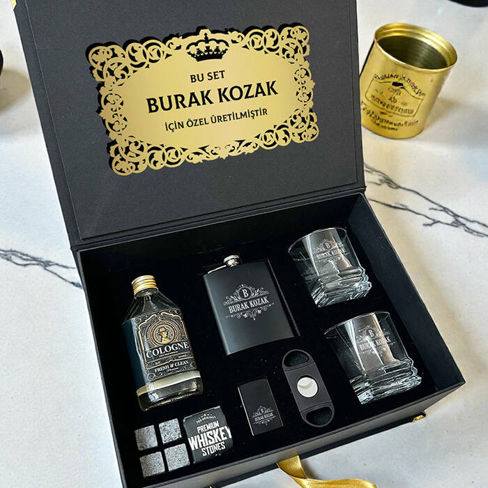 ** Siyah renkte fantezi kutu içerisinde gönderilmektedir. Kutu ölçüleri: 36 X 26 X 13 cm.** Set içerisinde yer alan 2 Adet viski bardağı üzerine isim lazer ile kalıcı şekilde işlenmektedir. 8,5 cm X 9,5 cm genişliğindedir. Hacim 210 cc.** Set içerisinde 2 adet Viski Bardağı + Kesede 4 Adet Viski Taşı + 1 Adet Metal Çakmak + 1 Adet Puro Makası + 1 Adet İçki matarası + 1 Adet Kolonya almaktadır.** Viski tüketen sevdiklerinize harika bir hediye seçeneğidir.** Bu premium set hafta içi saat 14.00'a kadar verilecek siparişler için aynı gün kargoya teslim edilmektedir.