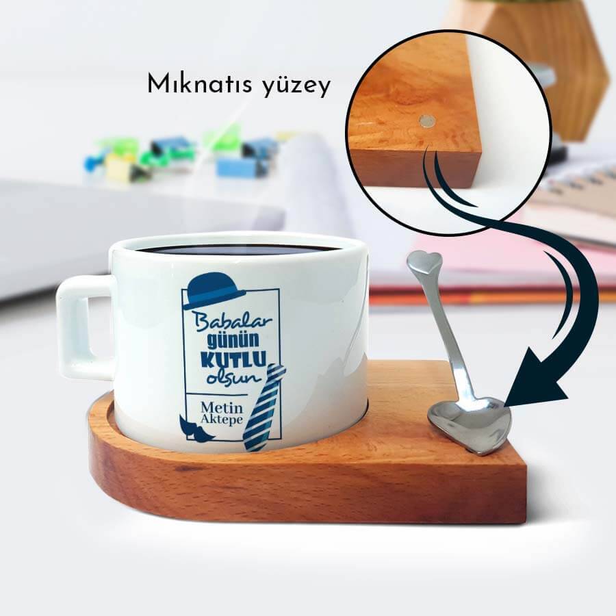 ** Fincan altlığı ahşap malzemeden (meşe ağacından) yapılmıştır. Üzerinde fincanı yerleştirmek için yuvarlak bir yuvası bulunmaktadır.** Çay kaşığının ucu ve sapı kalp şeklinde bir tasarıma sahiptir. Mıknatıs özelliği sayesinde düşmez.** Fincan 20 X 5,5 cm ölçülerine sahip olup, seramik malzemeden üretilmiştir.** Siparişiniz halinde kaşık ve ahşap altlığıyla birlikte gönderimi sağlanmaktadır.** Babalar Günü Hediyem Çay Fincanı, zorunlu haller dışında hafta içi saat 14.00'a kadar verilecek siparişlerde aynı gün kargoya teslim edilmektedir.