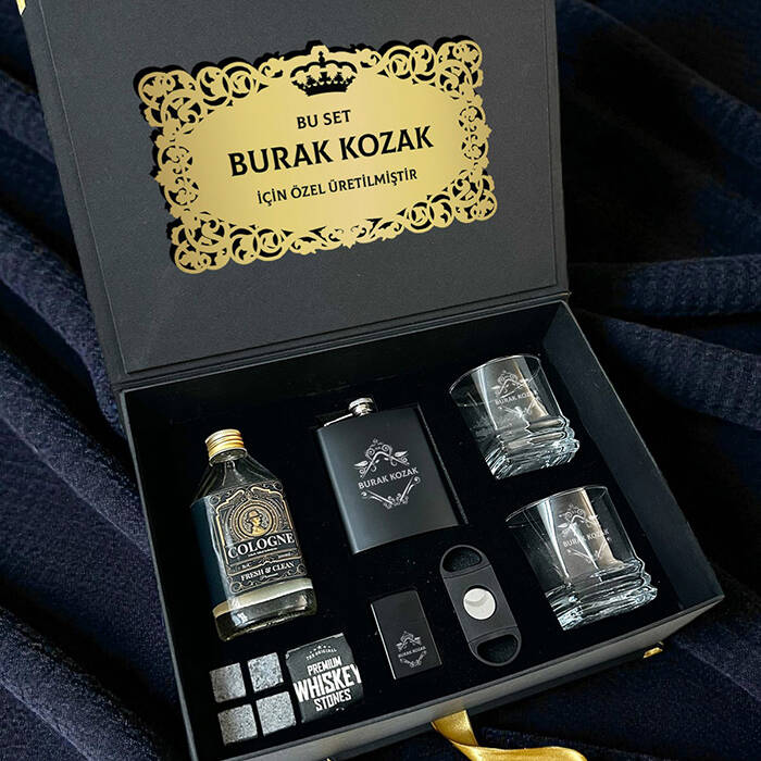 ** Siyah renkte fantezi kutu içerisinde gönderilmektedir. Kutu ölçüleri: 36 X 26 X 13 cm.** Set içerisinde yer alan 2 Adet viski bardağı üzerine isim lazer ile kalıcı şekilde işlenmektedir. 8,5 cm X 9,5 cm genişliğindedir. Hacim 210 cc.** Set içerisinde 2 adet Viski Bardağı + Kesede 4 Adet Viski Taşı + 1 Adet Metal Çakmak + 1 Adet Puro Makası + 1 Adet İçki matarası + 1 Adet Kolonya almaktadır.** Viski tüketen sevdiklerinize harika bir hediye seçeneğidir.** Bu premium set hafta içi saat 14.00'a kadar verilecek siparişler için aynı gün kargoya teslim edilmektedir.