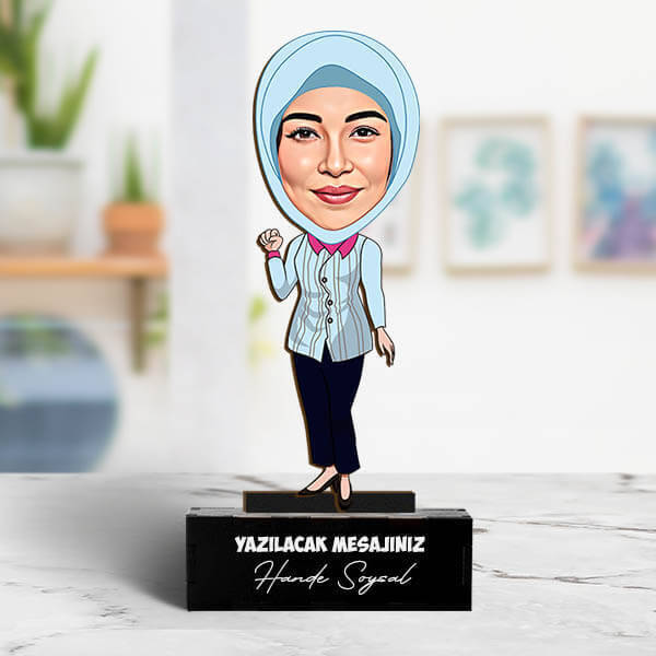 ** Biblo Ölçüleri: 18 cm uzunluk - Kaide ölçüleri: 9 x 3 cm.** Karikatür baskısı 3 mm kalınlıkta kaliteli MDF malzeme üzerine uygulanmaktadır.** Ahşap kaidesi siyah renk MDF malzemeden üretilmiş olup, dilediğiniz isim veya mesaj lazer ile üzerine kazınmaktadır.** Bu Esprili Bibloyu kişiye özel hale getirebilmemiz için Sepete Ekle butonu üzerindeki dosya ekle kısmından fotoğraf seçip yüklemeniz gerekmektedir.** Başörtülü Hanımlar İçin Hediyelik Karikatürlü Biblo hafta içi saat 14.00'a kadar verilecek siparişler için aynı gün kargoya teslim edilmektedir.** Lütfen Dikkat; karikatür çalışmasının daha kaliteli olabilmesi için yükleyeceğiniz fotoğrafın ön cepheden çekilmiş olmasına ve net olmasına önem gösteriniz.** Ürün üzerindeki karikatür, elle çizilmiş bir karikatür olmayıp, bilgisayar programları yardımıyla yapılmaktadır.Ürün Etiketleri