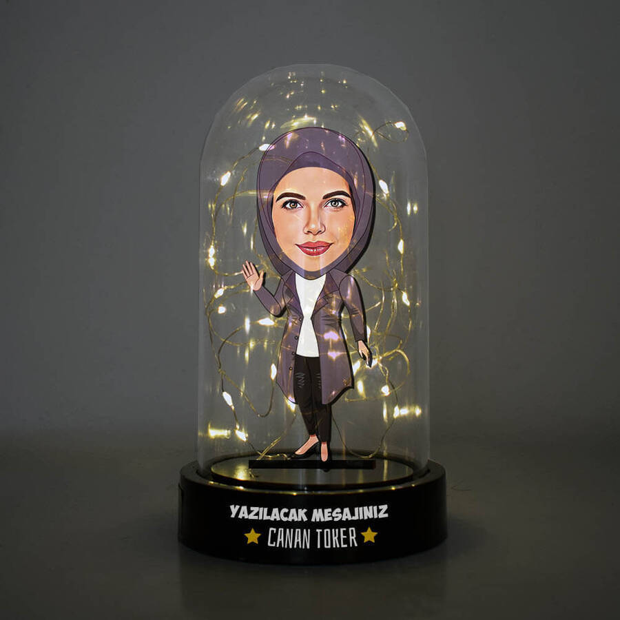 Başörtülü Harika Kadın Karikatürlü Işıklı Fanus Biblo