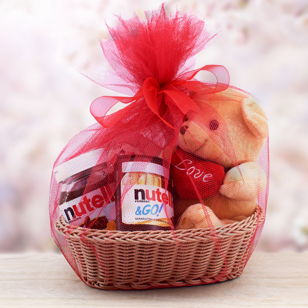 1- ) Sepet içerisinde 4 parça ürün bulunmaktadır.** 1 Adet Love kaslp yastık taşıyan sevimli oyuncak peluş ayıcık,** 1 adet 180 Gr. Nutella Çikolata Kavanozu,** 1 Adet Senin Hakkında Sevdiğim Şeyler Kartları ve** 1 Adet Nutella Go Çikolatası bulunmaktadır.2- ) Tüm ürünler sepet içerisine özenle yerleştirilir ve üzeri tülle kaplanarak, kurdele ile sarılır.3- ) Benim Tatliş Sevgilim Hediye Sepeti hafta içi saat 14:00'a kadar verilecek siparişlerinizde aynı gün kargoya teslim edilmektedir.