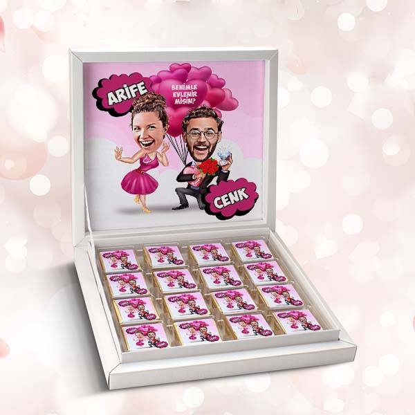 ** Ürün, beyaz renk şık ve kaliteli hediye kutusu içerisinde gönderimi sağlanmaktadır.** Hediye Kutusu ölçüleri :22 x 22 x 3,50 cm.dir.** Tercihe bağlı olarak 16'li,32'li ve 48'li adetlerden sipariş verebilirsiniz. Çikolatalar kare şeklinde sütlü çikolatadır.** Çikolatalarımız MABEL olup taptazedir. Çikolata ölçüleri 4 X 4 cm.dir.** Ürün kişiselleştirme çikolata ambalajı üzerine ve çikolata kutusunun iç yüzeyine yapılmaktadır.** Benimle Evlenir Misin Karikatürlü Çikolata hafta içi saat 14.00'a kadar verilen siparişlerde Aynı Gün Kargoya teslim edilmektedir.