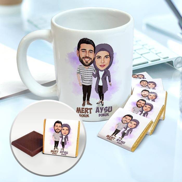 Birbirimize Aşığız Karikatürlü Kupa ve Çikolata