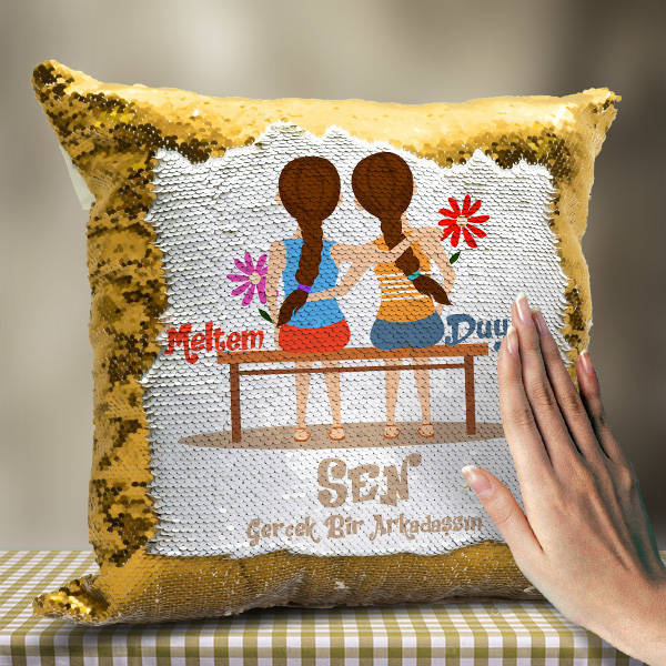 Sihirli bir yastık ile sevdiklerinizi şaşırtmak ister misiniz? O sizin en iyi arkadaşınız, en iyi sırdaşınız… onun için bir hediye almayı planlıyorsanız bu da sizin aranızda ki en büyük sırlar gibi gizemli olmalı. En İyi Arkadaşım Sihirli yastık ile önce sarı pullu bir yastık gibi dururken, ellerinizi sürmeniz ile altından çıkacak olan isimler ve iki kız arkadaş görseli çok eğlenceli bir hal alacak.