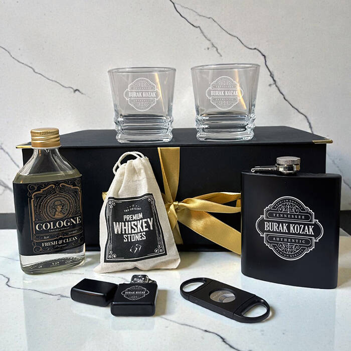 ** Siyah renkte fantezi kutu içerisinde gönderilmektedir. Kutu ölçüleri: 36 X 26 X 13 cm.** Set içerisinde yer alan 2 Adet viski bardağı üzerine isim lazer ile kalıcı şekilde işlenmektedir. 8,5 cm X 9,5 cm genişliğindedir. Hacim 210 cc.** Set içerisinde 2 adet Viski Bardağı + Kesede 4 Adet Viski Taşı + 1 Adet Metal Çakmak + 1 Adet Puro Makası + 1 Adet İçki matarası + 1 Adet Kolonya almaktadır.** Viski tüketen sevdiklerinize harika bir hediye seçeneğidir.** Bu premium set hafta içi saat 14.00'a kadar verilecek siparişler için aynı gün kargoya teslim edilmektedir.