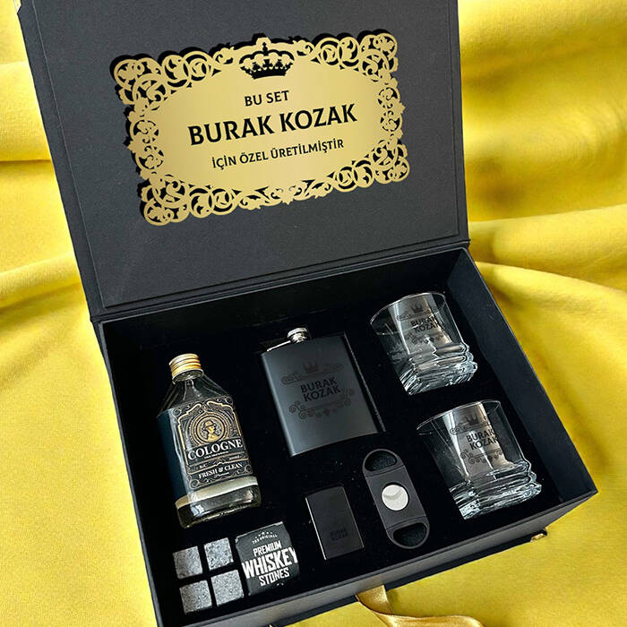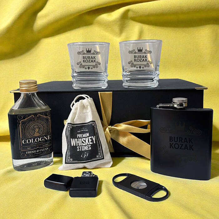 ** Siyah renkte fantezi kutu içerisinde gönderilmektedir. Kutu ölçüleri: 36 X 26 X 13 cm.** Set içerisinde yer alan 2 Adet viski bardağı üzerine isim lazer ile kalıcı şekilde işlenmektedir. 8,5 cm X 9,5 cm genişliğindedir. Hacim 210 cc.** Set içerisinde 2 adet Viski Bardağı + Kesede 4 Adet Viski Taşı + 1 Adet Metal Çakmak + 1 Adet Puro Makası + 1 Adet İçki matarası + 1 Adet Kolonya almaktadır.** Viski tüketen sevdiklerinize harika bir hediye seçeneğidir.** Bu premium set hafta içi saat 14.00'a kadar verilecek siparişler için aynı gün kargoya teslim edilmektedir.