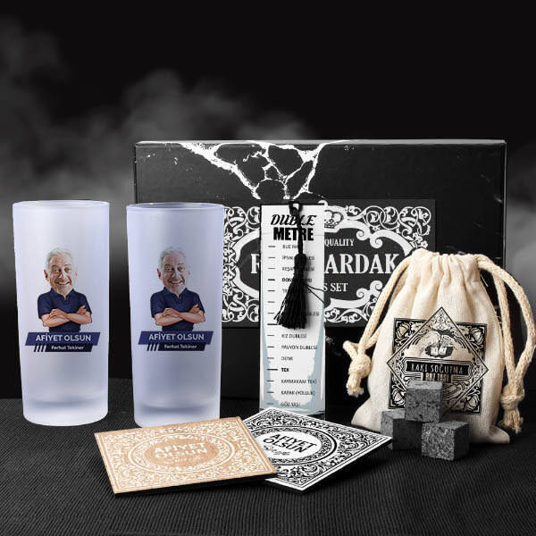 ** 18 X 24 X 10 cm mermer desenli siyah hediye kutulu konsept hediye kutusu içerisinde;** 2 Adet Kaliteli Rakı Bardağı.** 4 Adet Alkol Soğutma Taşı** 2 Adet Özel tasarım "Afiyet Olsun" ve "Şerefe" mesajlı ahşap bardak altlığı.** 1 Adet esprili bir dille hazırlanmış Duble Metre.** Özel tasarım siyah hediye kutusunda şık bir şekilde gönderilmektedir.** Rakı kadehleri üzerine silinmeyecek baskı tekniği ile kişiselleştirme yapılmaktadır.** Erkeklere Karikatürlü Rakı Kadehi Seti Hediye Kutusu hafta içi saat 14.00'a kadar verilecek siparişlerde aynı gün kargoya teslim edilmektedir.