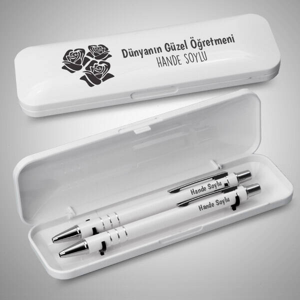 1 -) Kalem kutusu içerisinde 2 adet kalem bulunmaktadır.2 -) Kalem kutusu beyaz renkte olup oldukça şık bir sunuma sahiptir.3 -) Kalem setindeki kalemlerden biri tükenmez; diğeri ise uçlu kurşun kalemden oluşmaktadır.4 -) Beyaz Kutunun Kutu ölçüleri: 16 x 5 x 2,5 cm'dir.5 -) Kalem kutusu üzerine dilediğiniz kişinin ismini veya mesajınızı yazdırabilirsiniz.6 -) Gül Sembollü Öğretmene Özel Kalem Seti hafta içi saat 14.00'a kadar verilecek siparişlerde aynı gün kargoya teslim edilmektedir.Ürün Etiketleri