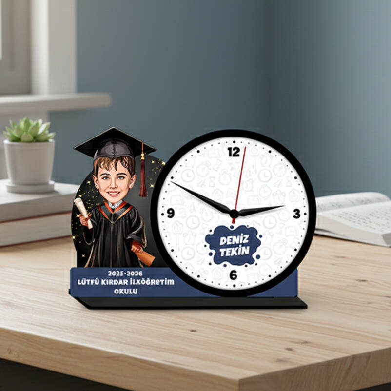 İlkokul Erkek Öğrenci Mezuniyet Karikatürlü Masa Saati