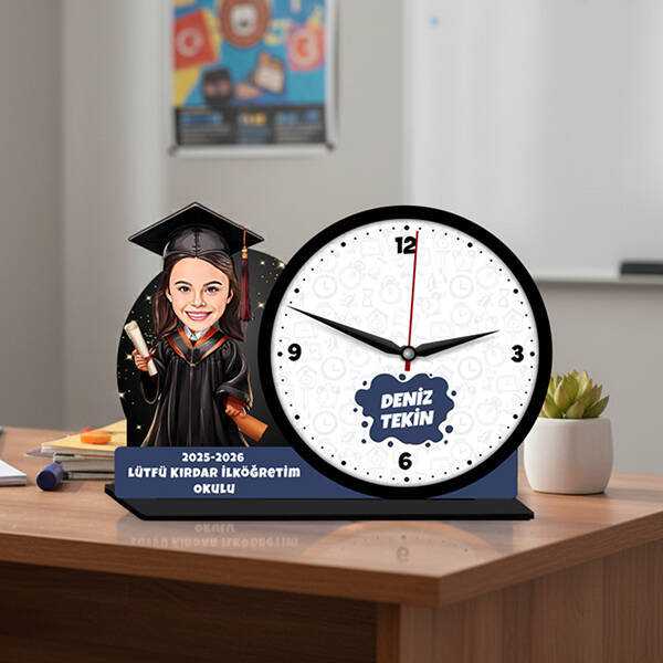 İlkokul Kız Öğrenci Mezuniyet Karikatürlü Masa Saati