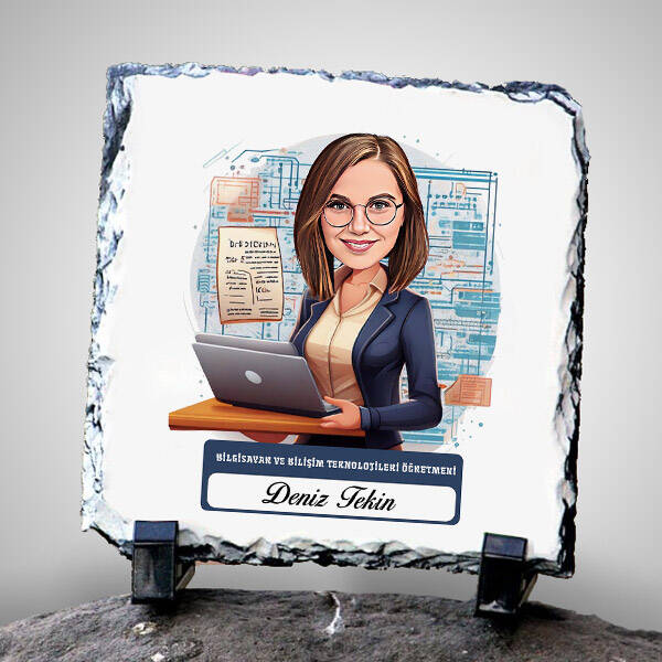 Kadın Bilgisayar Öğretmeni Temalı Karikatürlü Taş