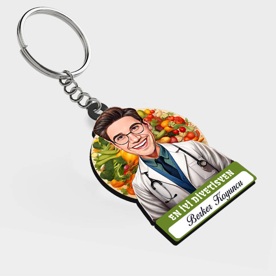 Beslenme programlarının ve tartıların dünyasında disipliniyle tanınan uzman beylere, esprili bir mola verdirin. Kendi karikatürünü anahtarlarında taşıyan diyetisyenimiz, her kapıyı sağlık ve neşeyle açmaya devam edecek.