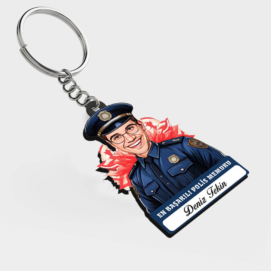 Gece gündüz huzurumuz için nöbet tutan polis dostunuza, ekip otosunun anahtarını takarken keyif alacağı özel bir tasarım hediye edin. Karikatürlü polis figürüyle canlanan bu isimli anahtarlık, onun disiplinli hayatına renk katan en samimi armağandır.