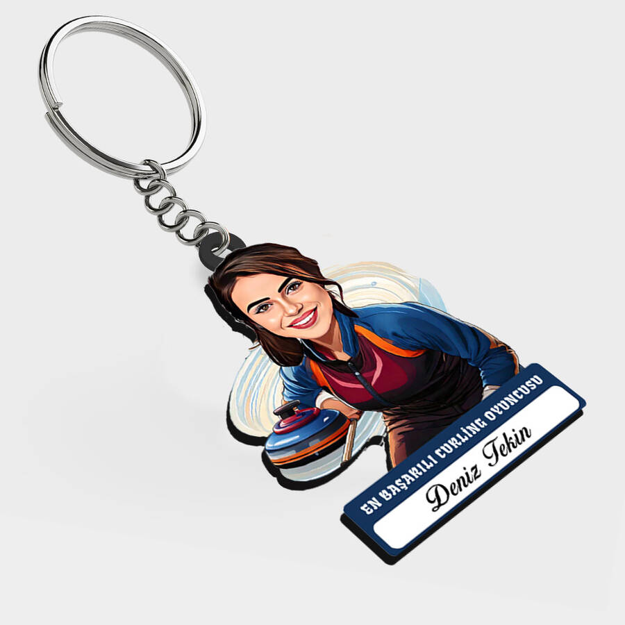 Karikatürlü - Kadın Curling Oyuncusu İsimli Anahtarlık