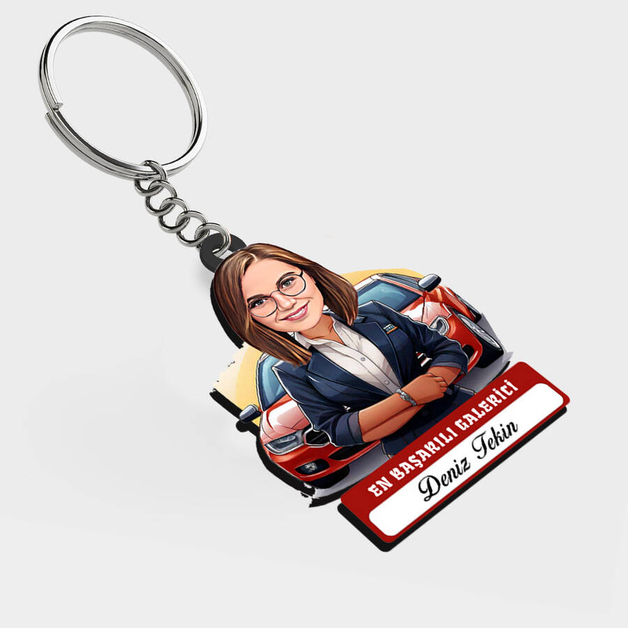 Otomotiv sektöründe zarafetiyle ve başarısıyla parlayan kadın galerici hanımlara, şık bir sürüş deneyimi tadında hediye verin. Kendi karikatürüyle süslü bu anahtarlık, galerinin en dikkat çeken ve en orijinal parçası olmaya aday.
