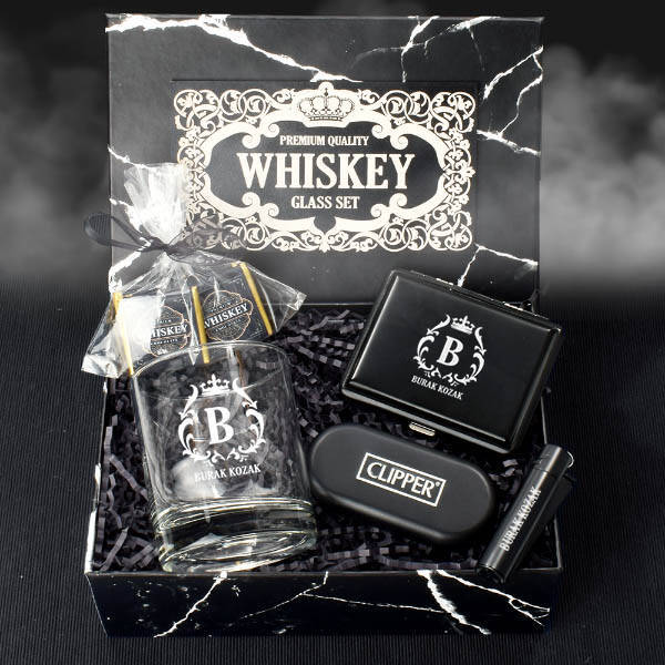 ** 18 X 24 X 10 cm mermer desenli siyah hediye kutulu konsept hediye kutusu içerisinde;** 1 Adet Kaliteli Viski Bardağı. İsme özel olup, viski bardağı ölçüleri 9 cm ve çapı 7 cm'dir. Kapasitesi 800 cc hacim ölçeğine sahiptir.** 4 Adet Viski Taşı** 6 Adet özel tasarım kare sütlü çikolata.** 1 Adet Kişiye Özel Clipper Marka Çakmak ve 1 Adet Metal Sigara Tabakası** Özel tasarım kutu içerisinde şık bir şekilde gönderilmektedir.** Viski kadehleri, çakmak ve sigara tabakası üzerine lazer işleme tekniği ile kazıma yapılmakta olup asla silinmez özelliktedir.** Kişiye Özel Viski Bardağı Çakmak ve Sigaralık Seti Original hafta içi saat 14.00'a kadar verilecek siparişlerde aynı gün kargoya teslim edilmektedir.