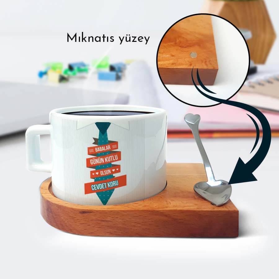 ** Fincan altlığı ahşap malzemeden (meşe ağacından) yapılmıştır. Üzerinde fincanı yerleştirmek için yuvarlak bir yuvası bulunmaktadır.** Çay kaşığının ucu ve sapı kalp şeklinde bir tasarıma sahiptir. Mıknatıs özelliği sayesinde düşmez.** Fincan 20 X 5,5 cm ölçülerine sahip olup, seramik malzemeden üretilmiştir.** Siparişiniz halinde kaşık ve ahşap altlığıyla birlikte gönderimi sağlanmaktadır.** Kravat Tasarımlı Babalar Günü Çay Fincanı, zorunlu haller dışında hafta içi saat 14.00'a kadar verilecek siparişlerde aynı gün kargoya teslim edilmektedir.