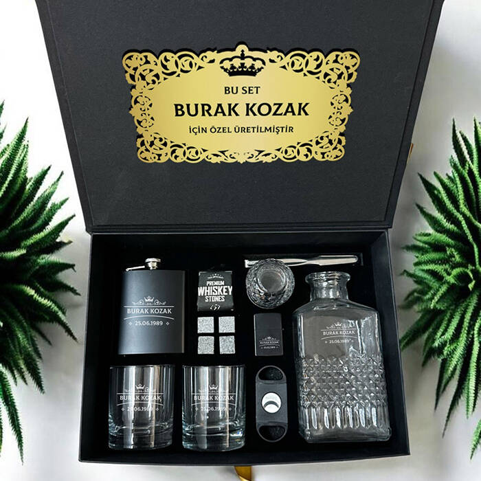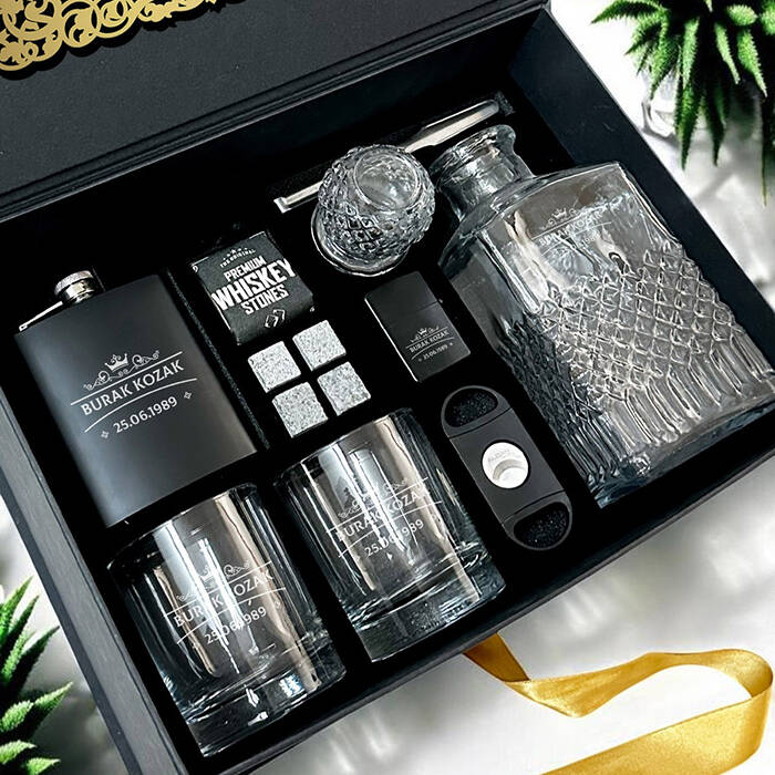 ** Siyah renkte fantezi kutu içerisinde gönderilmektedir. Kutu ölçüleri: 36 X 26 X 13 cm.** Set içerisinde yer alan 2 Adet viski bardağı üzerine isim lazer ile kalıcı şekilde işlenmektedir. 8,5 cm X 9,5 cm genişliğindedir. Hacim 210 cc.** Set içerisinde 2 adet Viski Bardağı + özel Kesede 4 Adet Viski Taşı + 1 Adet Metal Çakmak + 1 Adet Puro Makası + 1 Adet İçki matarası + 1 Adet Viski Şişesi ve Buz Tutacağı yer almaktadır.** Viski tüketen sevdiklerinize harika bir hediye seçeneğidir.** Bu premium set hafta içi saat 14.00'a kadar verilecek siparişler için aynı gün kargoya teslim edilmektedir.
