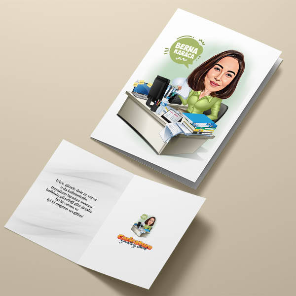 Ofisteki kadın karikatürlü tebrik kartı: çalışkan ve başarılı bir ofis çalışanını kutlamak istediğinizde, ofisteki kadın karikatürlü tebrik kartı en doğru seçenek olacaktır. Espiri dolu ve detaylı tasarımı ile dikkat çeken bu kart, iş hayatındaki başarıyı ve tebrikleri ifade eden harika bir hediye seçeneğidir.