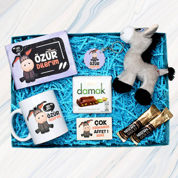 1 -) Hediye kutusu içerisinde 8 parça ürün yer almaktadır.** 1 Adet Çok Pişmanım Beni Affet Kitabı. Kitapla ilgili detaylı bilgiye buradan ulaşabilirsiniz.** 1 Adet Beni affet özür dilerim kupa bardak. Üzerinde eşek figürü ile oldukça sevimli bir tasarıma sahiptir.** 1 Adet kupa bardakla aynı tasarıma sahip papatya anahtarlık.** 1 Adet Eşek pelüş oyuncak ayıcık.** 1 Adet Antep fıstıklı kare damak çikolata.** 1 Adet eşek figürlü ÇOK PİŞMANIM AFFET BENİ mesajlı buzdolabı magneti.** 2 Adet Nescafe Gold kahve2 -) Kutu Ölçüleri: 35 X 25 X 11 cm.'dir. Harika bir sunuma sahip olan bu özel hediye kutusuyla Sevgilinize eşsiz bir Özel Gün sürprizi yapabilirsiniz.3 -) Kutu içerisinde Z kesim diye adlandırılan kırpıntı süs kağıtları yer almaktadır. Bu şekilde hediye kutusu içerisindeki ürünler daha zarif bir görünüme kavuşur.4 -) Özür Dilerim Konsept Hediye Kutusu, hafta içi saat 14.00'a kadar vereceğiniz siparişlerinizde aynı gün kargoya teslim edilmektedir.Ürün Etiketleri
