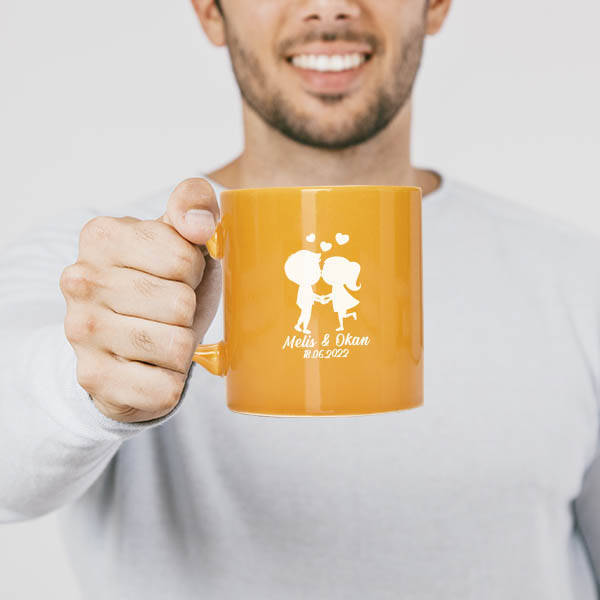 ** Kupa bardak üzerindeki baskı 40 - 80 derecede yıkamaya dayanıklıdır. Uzun süreli kullanım için ELDE yıkanması tavsiye edilir.** Kupa Bardağın dışı ve içi turuncu renktedir. Silinmez özellikte lazer ile dış yüzeyi kazınmaktadır.** Materyal: Kupa Bardak seramik malzemeden üretilmiştir. ÖLÇÜLERİ: 8,0 ağız genişliği ve 13 cm yükseklik.** Bu turuncu bardağı kişiye özel hale getirebilmemiz için Sepete Ekle butonu üzerindeki kişiselleştirme alanlarını doldurmanız gerekmektedir.** Romantik Aşıklar Kişiye Özel Bardak Turuncu hafta içi saat 14.00'a kadar verilecek siparişlerde aynı gün kargoya teslim edilmektedir.Ürün Etiketleri