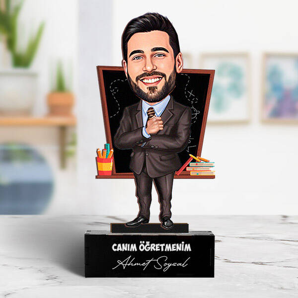 Siyah takım elbiseli öğretmen karikatürlü biblo, öğretmeninizi gülerken görmek istediğiniz bir anıya dönüştüren özel bir hediye seçeneğidir. Mükemmel baskı kalitesi ve el emeğiyle hazırlanan bu biblo, öğretmeninizin özel günlerini daha da anlamlı kılar. Siyah takım elbise detayıyla öğretmenin şıklığını vurgulayan bu bibloyu öğretmeninizin evinde veya çalışma masasında gururla sergileyebilir.
