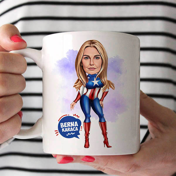 ** Kupa bardak üzerindeki baskı resimler veya yazılar 40 - 80 derecede yıkamaya dayanıklıdır. Ancak, daha uzun süreli kullanım için ELDE yıkanması tavsiye edilir.** Materyal: Kupa Bardak Porselen malzemeden üretilmiştir.** Bu Esprili Kupa bardağı kişiye özel hale getirebilmemiz için Sepete Ekle butonu üzerindeki dosya ekle kısmından fotoğraf seçip yüklemeniz gerekmektedir.** Süper Kahraman Kadın Karikatürlü Bardak hafta içi saat 14.00'a kadar verilecek siparişlerde aynı gün kargoya teslim edilmektedir.** Lütfen Dikkat; karikatür çalışmasının daha kaliteli olabilmesi için yükleyeceğiniz fotoğrafın ön cepheden çekilmiş olmasına ve net olmasına önem gösteriniz.** Ürün yüzeyindeki çalışma elle bir karikatür çizimi olmayıp, bilgisayar programları aracılığıyla karikatür çalışması yapılmaktadır.