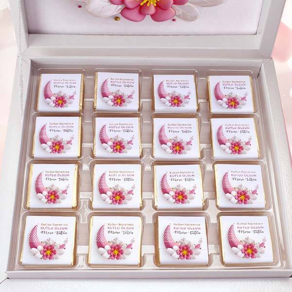 ** Ürün, beyaz renk şık ve kaliteli hediye kutusu içerisinde gönderimi sağlanmaktadır.** Hediye Kutusu ölçüleri :22 x 22 x 3,50 cm.dir.** Tercihe bağlı olarak 16'li,32'li ve 48'li adetlerden sipariş verebilirsiniz. Çikolatalar kare şeklinde sütlü çikolatadır.** Çikolatalarımız MABEL olup taptazedir. Çikolata ölçüleri 4 X 4 cm.dir.** Ürün kişiselleştirme çikolata ambalajı üzerine ve çikolata kutusunun iç yüzeyine yapılmaktadır.** Süslemeli Kişiye Özel Kurban Bayramı Çikolatası hafta içi saat 14.00'a kadar verilen siparişlerde Aynı Gün Kargoya teslim edilmektedir.