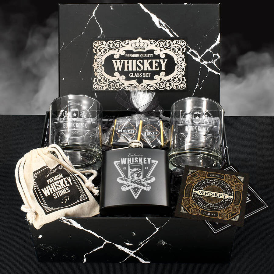 ** 18 X 24 X 10 cm mermer desenli siyah hediye kutulu konsept hediye kutusu içerisinde;** 2 Adet Kaliteli Viski Bardağı. İsme özel olup, viski bardağı ölçüleri 9 cm ve çapı 7 cm'dir. Kapasitesi 800 cc hacim ölçeğine sahiptir.** 4 Adet Viski Taşı** Matara 6 OZ - 180 Ml kapasiteye sahiptir. Ölçüleri : 11 X 9,5 X 2 cm.dir. Mataranın kapağı sıvı geçirmez metal contadan üretilmiştir.** 2 Adet özel tasarım ahşap bardak altlığı.** 6 Adet özel tasarım kare sütlü çikolata.** Özel tasarım kutu içerisinde şık bir şekilde gönderilmektedir.** Viski kadehleri üzerine lazer işleme tekniği ile kazıma yapılmakta olup asla silinmez özelliktedir.** Tasarım Viski Bardakları ve İçki Matarası Whiskey Set hafta içi saat 14.00'a kadar verilecek siparişlerde aynı gün kargoya teslim edilmektedir.